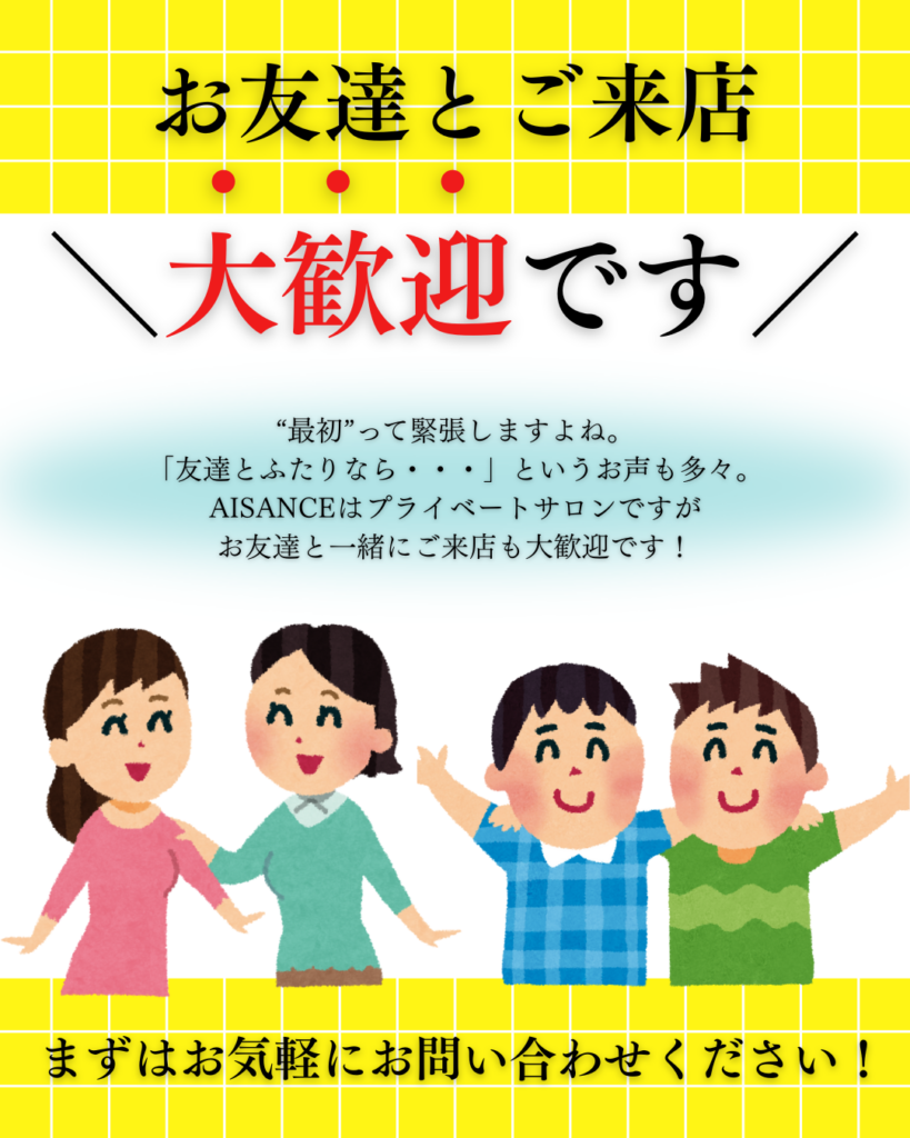 もちろん、お友達同士で来られても、施術自体はお一人ずつしっかり対応いたしますのでご安心ください✨